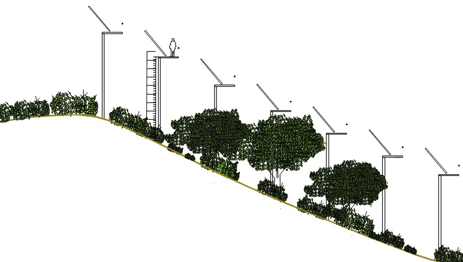 COMBINA PLACAS FOTOVOLTAICAS ELEVADAS SOBRE UNA PLATAFORMA DE MANTENIMIENTO ACCESIBLE Y CON UN RIEGO POR GOTEO SUBTERRANEO, CON CONTROL ELECTRONICO Y PROGRAMABLE, SECTORIZADO CON ELECTROVALVULAS Y SEGUN DATOS DE SENSORES DE HUMEDAD EN EL TERRENO O A BORDO DE DRONES SE REALIZA EL RIEGO.