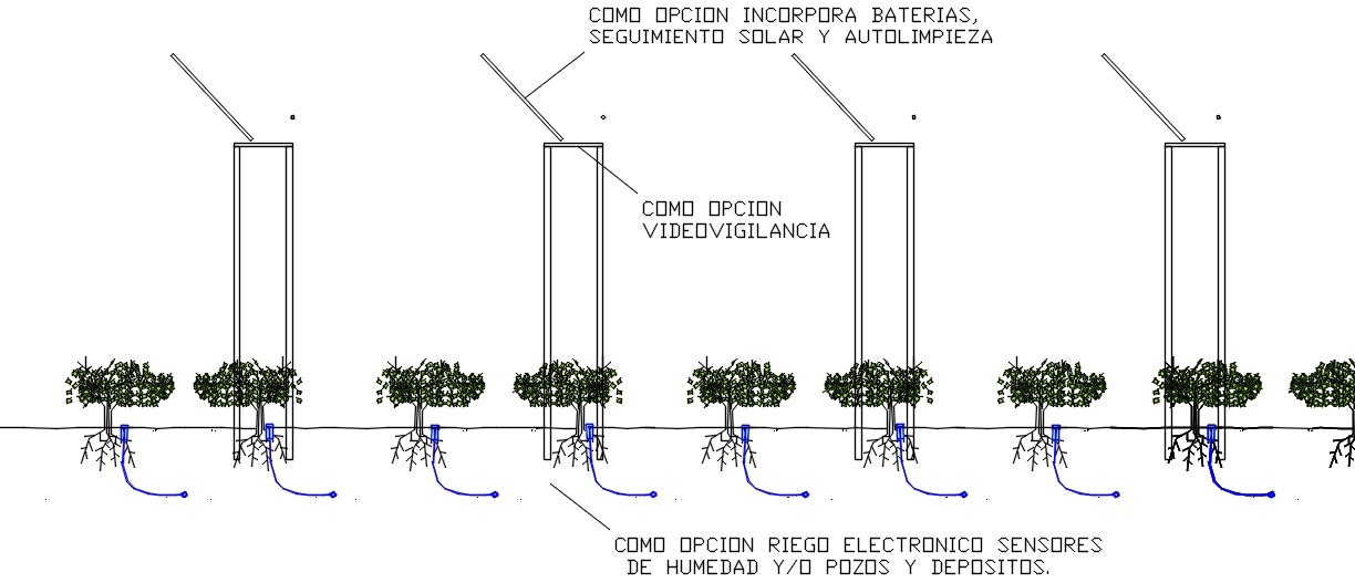 SE CAPTA ENERGIA FOTOVOLTAICA Y EOLICA PARA EXTRAER AGUA DE LOS POZOS Y/O PARA PROPORCIONAR ENERGIA A LAS DESALADORAS, A LOS SISTEMAS ELECTRONICOS Y DE COMUNICACION, A ELECTROVALVULAS, A LAS BOMBAS IMPULSORAS, A LOS SENSORES DE HUMEDAD, A LOS DRONES, A LAS CAMARAS DE VIDEOVIGILANCIA, A LAS CASAS DE EMPLEADOS, ETC, EL AGUA EXTRAIDA O DESALADA SE ACUMULA EN DEPOSITOS AEREOS O SUBTERRANEOS.