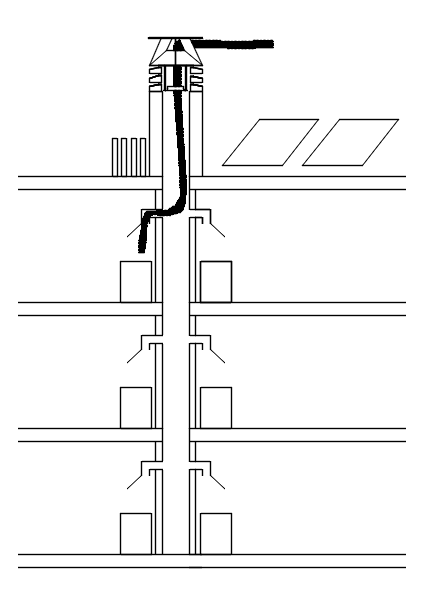 Es mejor y es sencilo colocar un ventilador comunitario en la coronacion del conducto dejanto todo el conducto en depresion y ademas puede alimentarse con energia fotovoltaica.